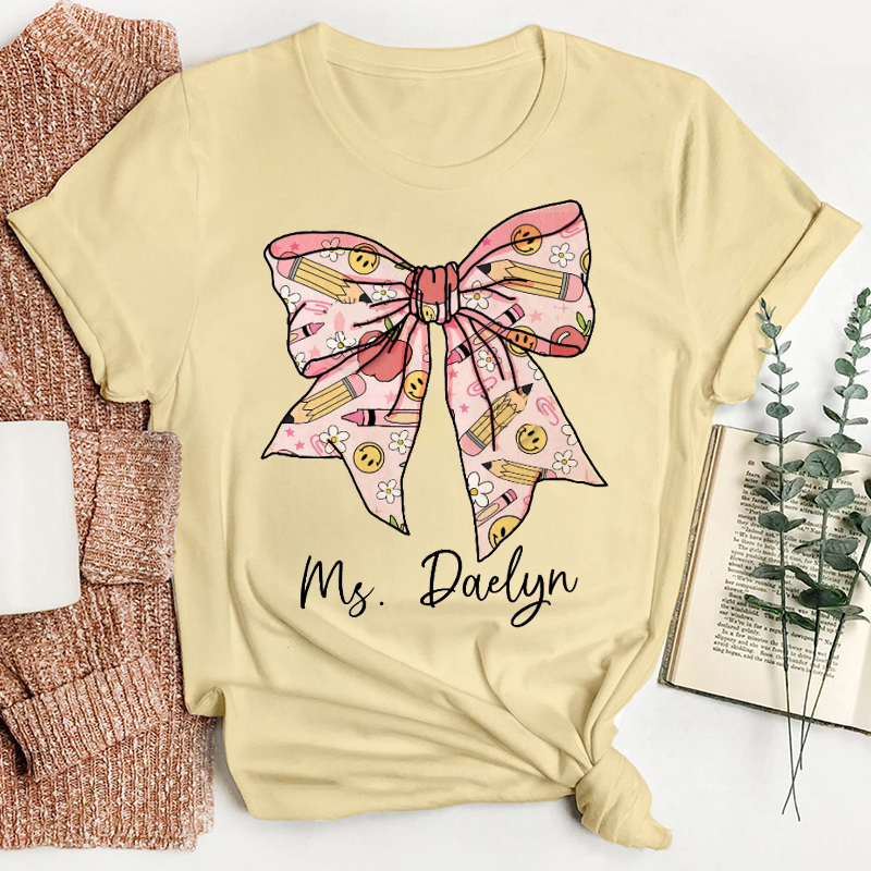 Personalized Pink Smiley Pencil Bow Teacher T-Shirt