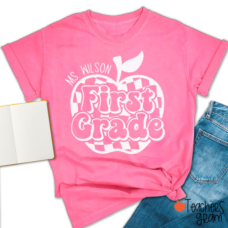 Personalized Teacher's Name And Grade Plaid Apple Icon Teacher T-Shirt
