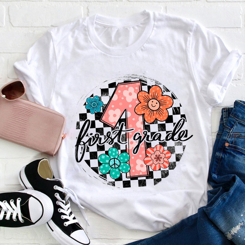 Personalized Your Grade Checkerboard Flowers Teacher T-Shirt