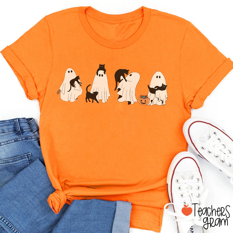 Halloween Black Cat And Ghost Teacher T-Shirt