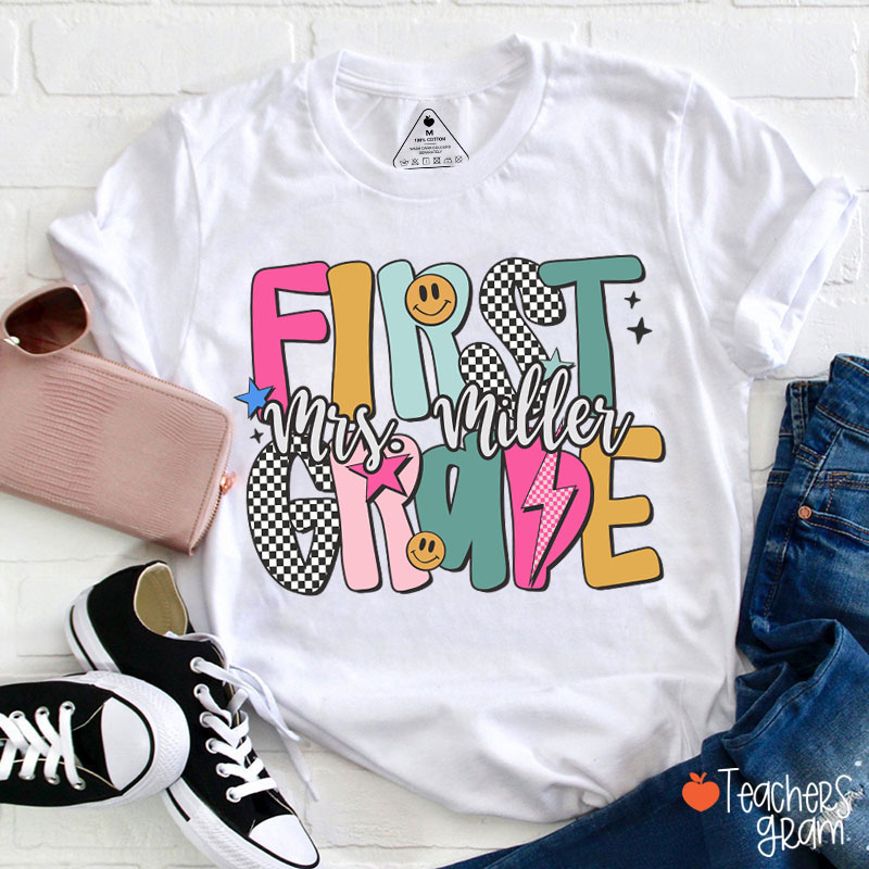 Personalized Grade Checkered Smiley Lightning Teacher T-Shirt