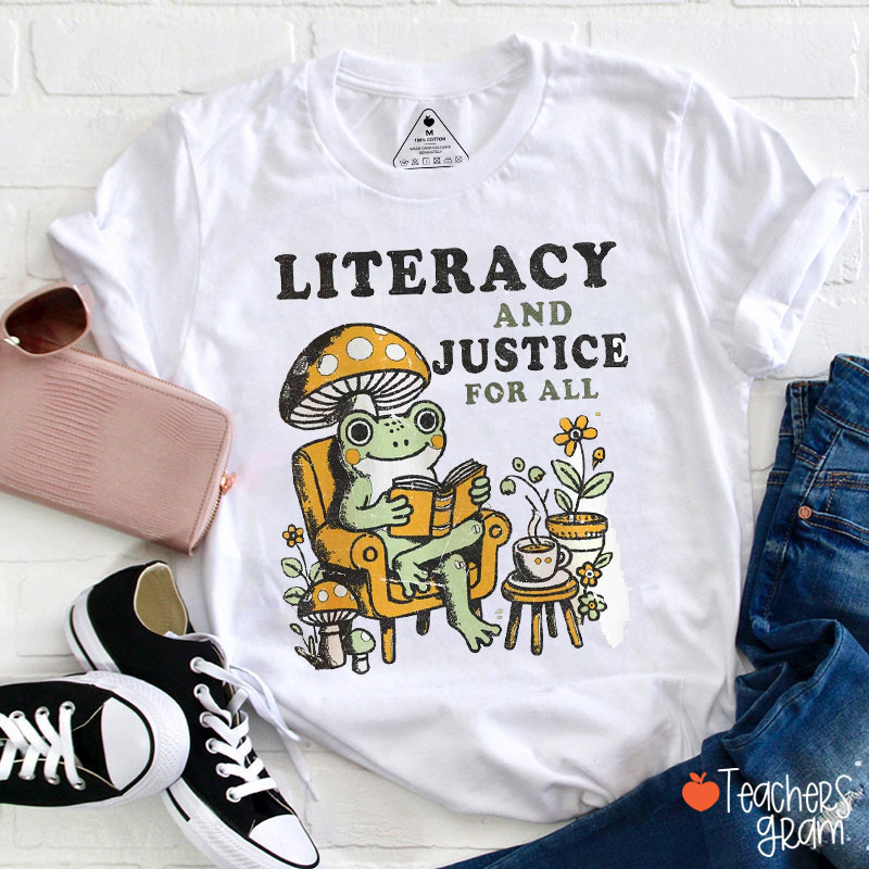 Literacy And Justice For All Reading Frog Teacher T-Shirt