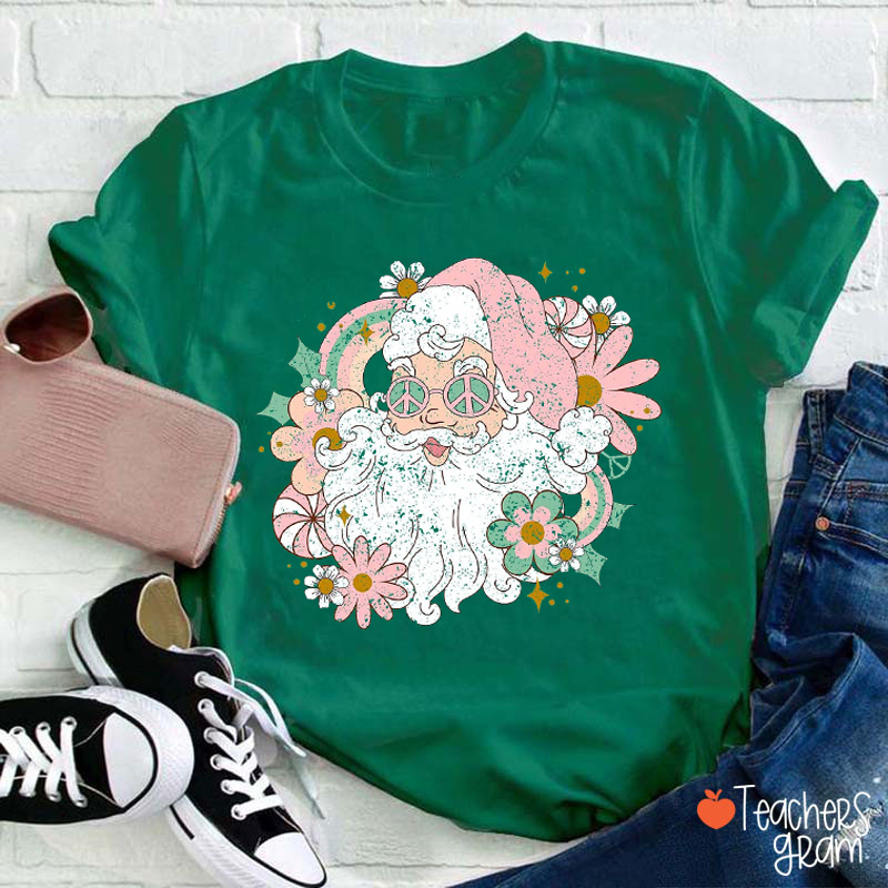 Floral Santa Merry Christmas Teacher T-Shirt