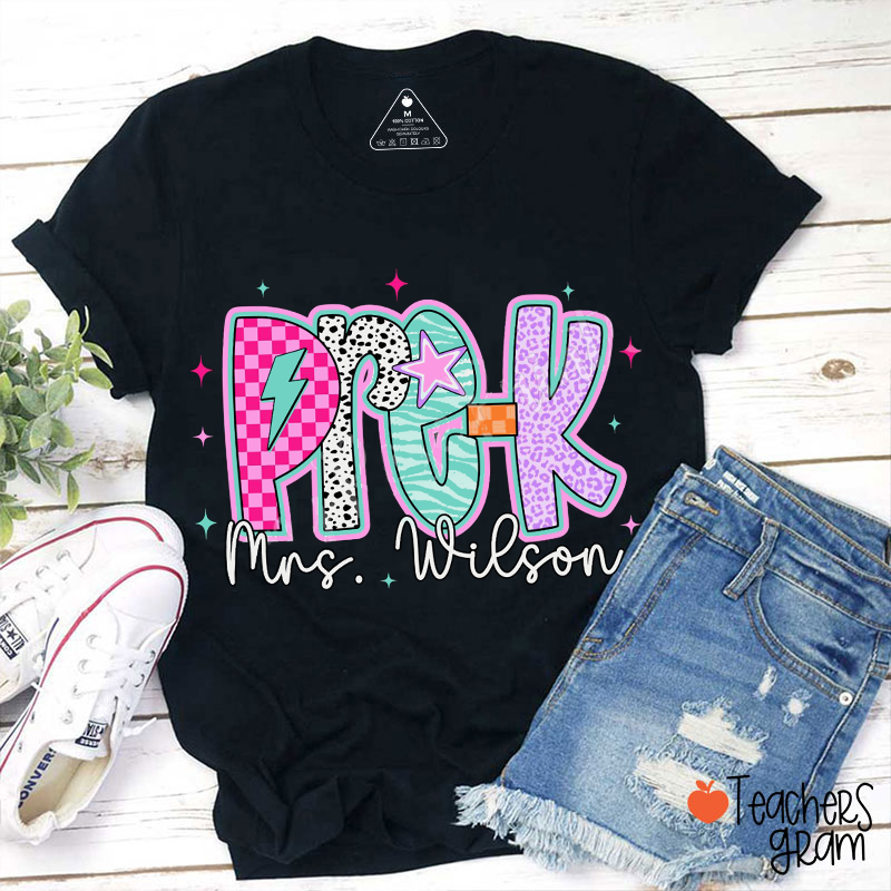 Personalized Neon Disco Pattern Font Teacher T-Shirt