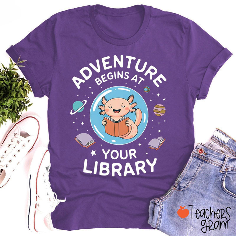 Adventure Begins At Your Library Teacher T-Shirt