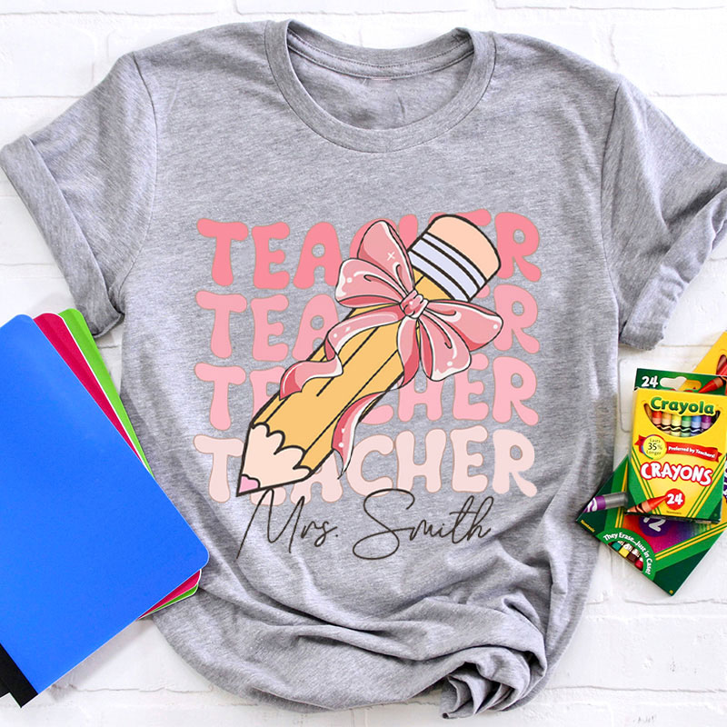Personalized Name Pencil With Pink Bow Teacher T-Shirt