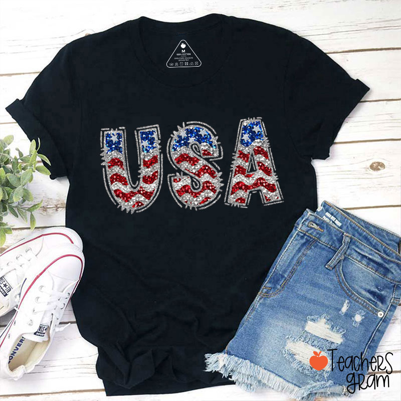 Stars And Stripes Glitter USA Teacher T-Shirt