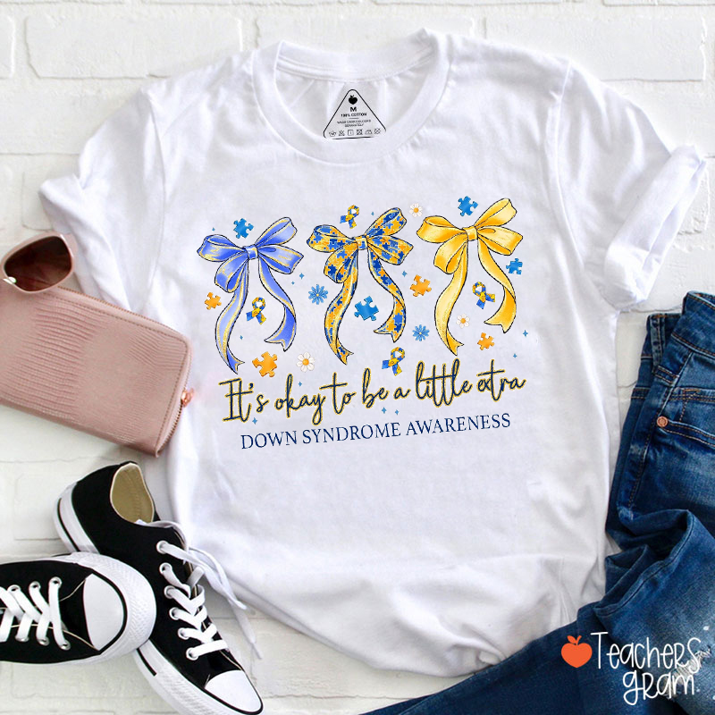It's Okay To Be A Little Extra Down Syndrome Awareness Coquette Bow Teacher T-Shirt