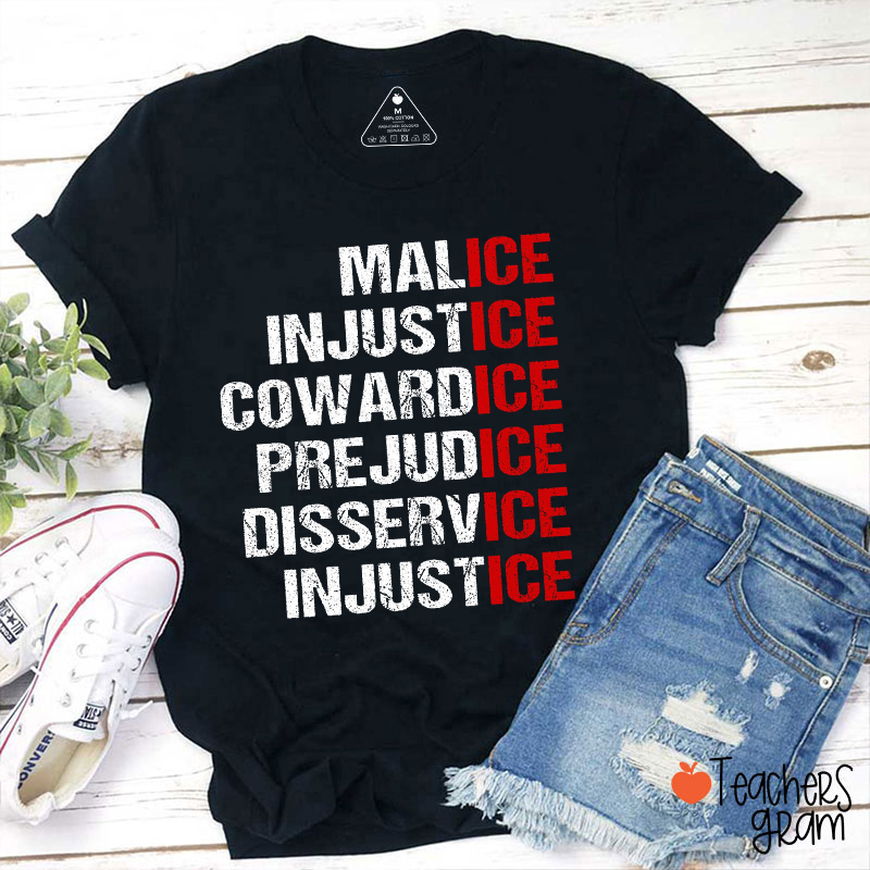Malice Injustice Cowardice Prejudice Disservice Injustice Teacher T-Shirt