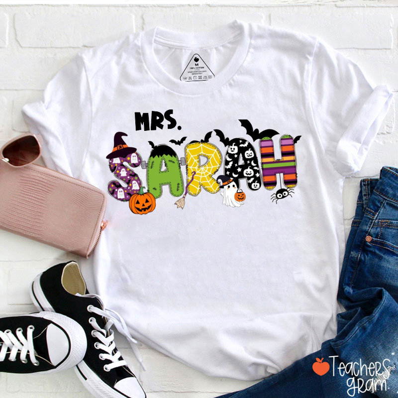 Personalized Name Halloween Bat Pumpkin Ghost Teacher T-Shirt