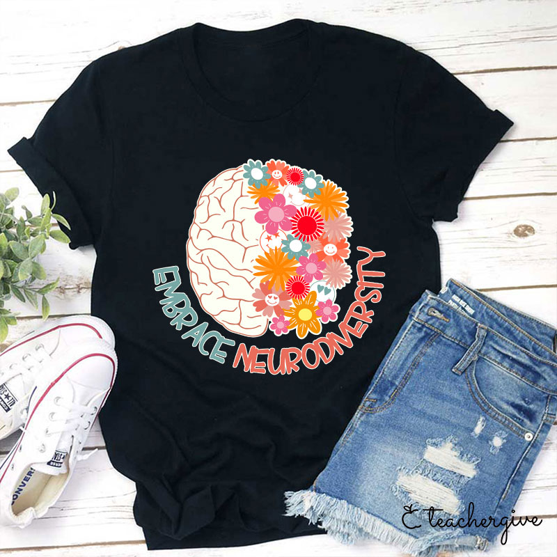 Embrace Neurodiversity Floral Brain Smile Faces Teacher T-Shirt