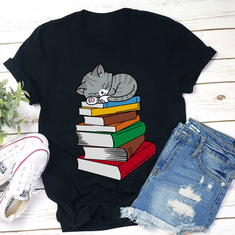 Cat Sleeps On A Book Teacher T-Shirt