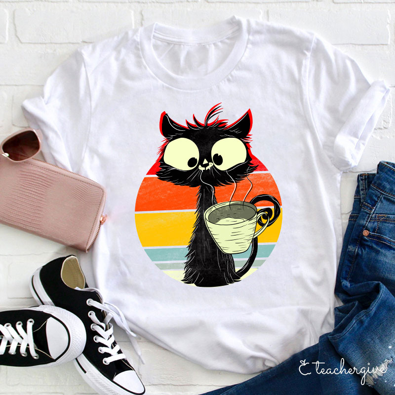 Cat Drinking Coffee Teacher T-Shirt