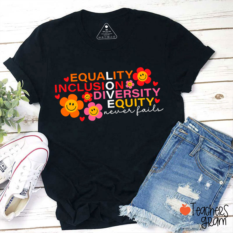 Equality Inclusion Diversity Equity Never Fails Teacher T-Shirt
