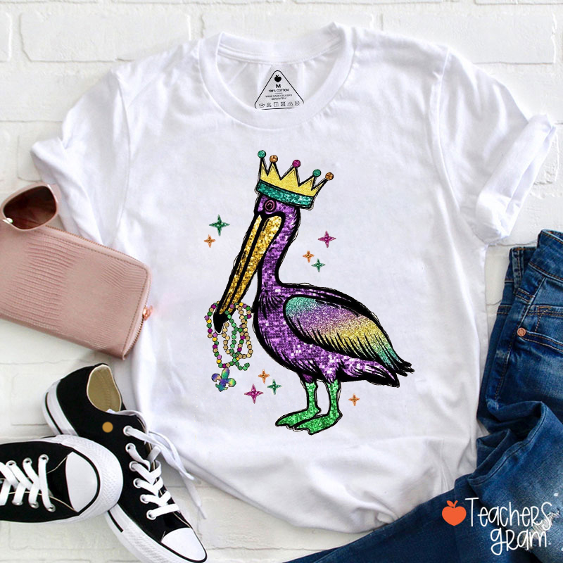 Faux Glitter Mardi Gras Pelican Teacher T-Shirt