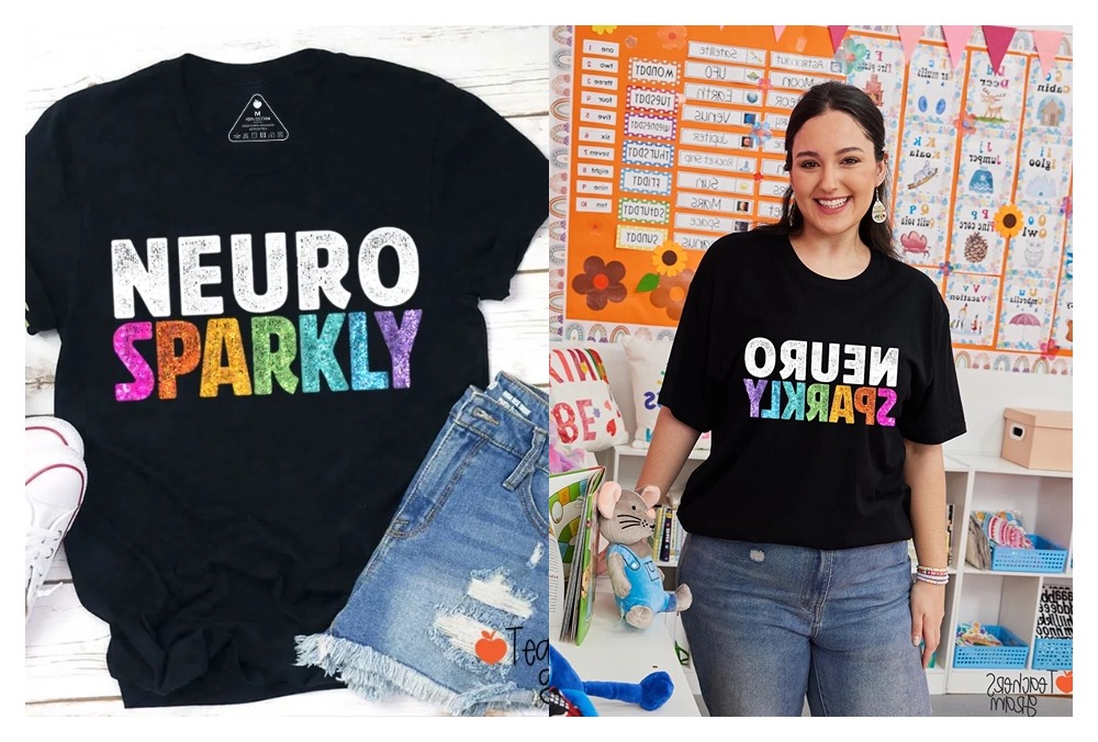 The “Neuro Sparkly” shirt is a vibrant celebration of neurodiversity. The design features “NEURO” in bold white letters, providing a strong contrast to “SPARKLY,” which is rendered in a dazzling spectrum of colors. This colorful array symbolizes the brilliance and uniqueness of every neurodiverse individual. The shirt captures the essence of diversity in learning styles, making it a perfect choice for teachers who champion inclusivity. The sparkling colors not only catch the eye but also serve as a metaphor for the vibrant contributions of neurodiverse students.