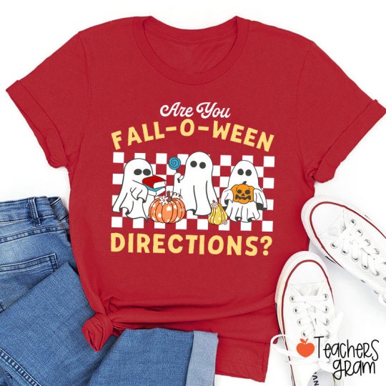 Ready to add some festive flair to your wardrobe? Visit TeachersGram.com to shop the Fall-O-Ween Directions Teacher T-Shirt and explore our full collection of seasonal teacher apparel.