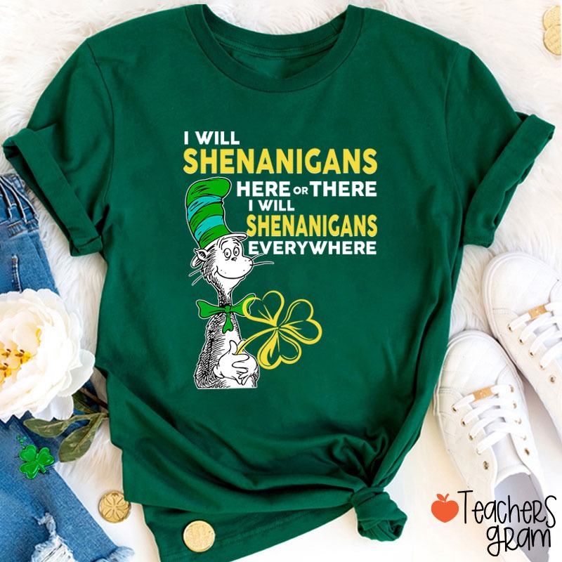 The "I Will Shenanigans Here Or There" t-shirt captures the playful essence of Dr. Seuss with its vibrant green color and whimsical design. Featuring a mischievous character and a cheeky phrase, this shirt is perfect for teachers who love to infuse fun into their classrooms. The design includes a shamrock, adding a touch of luck and festivity, making it ideal for St. Patrick's Day celebrations or any day when a bit of humor is needed. Pair it with jeans and sneakers for a casual, spirited look that resonates with students and fellow educators alike.
