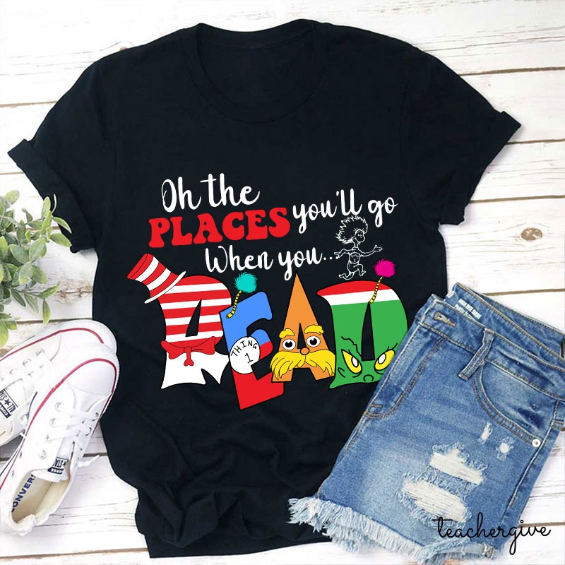 The "Oh The Places You'll Go When You Read" t-shirt combines the adventurous spirit of Dr. Seuss's classic book with a celebration of reading. The design features bold, colorful letters and playful characters, serving as a motivational reminder of the endless possibilities that books offer. This shirt is perfect for teachers who want to inspire their students to explore new worlds through literature. Pair it with leggings or a relaxed fit for a comfortable and inspiring look that encourages curiosity and imagination. The shirt's uplifting message makes it ideal for promoting a love for reading and sparking discussions about the adventures that await within the pages of a book.