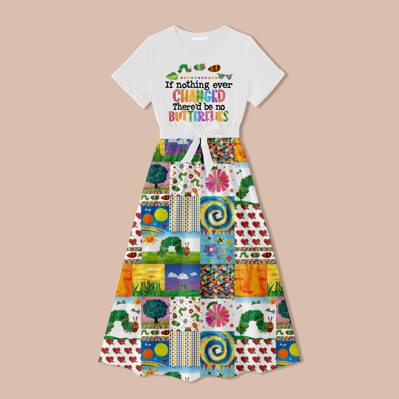 This dress is all about transformation and growth—two things every teacher values. The top features the inspiring quote, “If nothing ever changed, there’d be no butterflies,” paired with charming caterpillar and butterfly graphics. The skirt showcases a vibrant patchwork of nature-inspired patterns, including flowers, trees, and colorful butterflies, creating a visually stunning design.