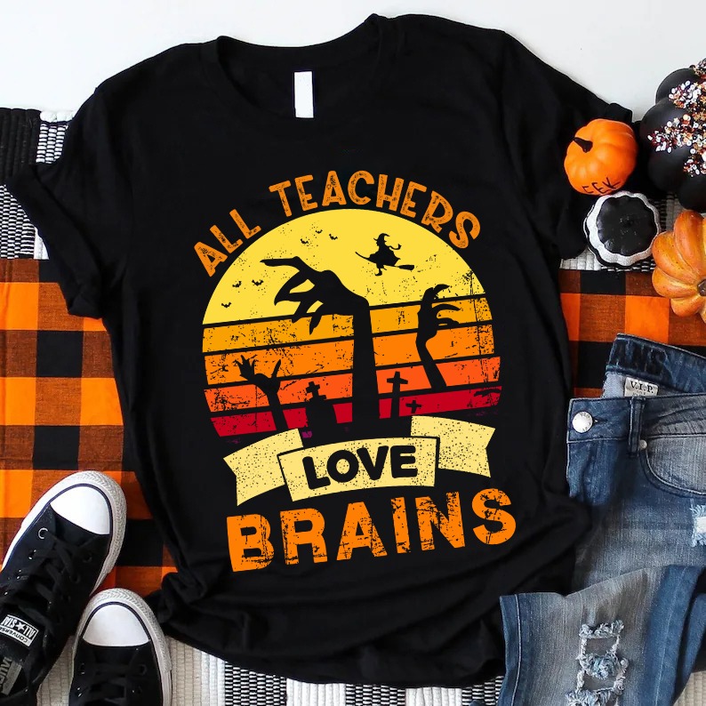 This shirt takes a humorous approach to Halloween, combining zombies with a playful nod to teachers’ love for learning. The retro sunset design, paired with silhouettes of zombies and the slogan “All Teachers Love Brains,” creates a fun, vibrant look that’s sure to grab attention.