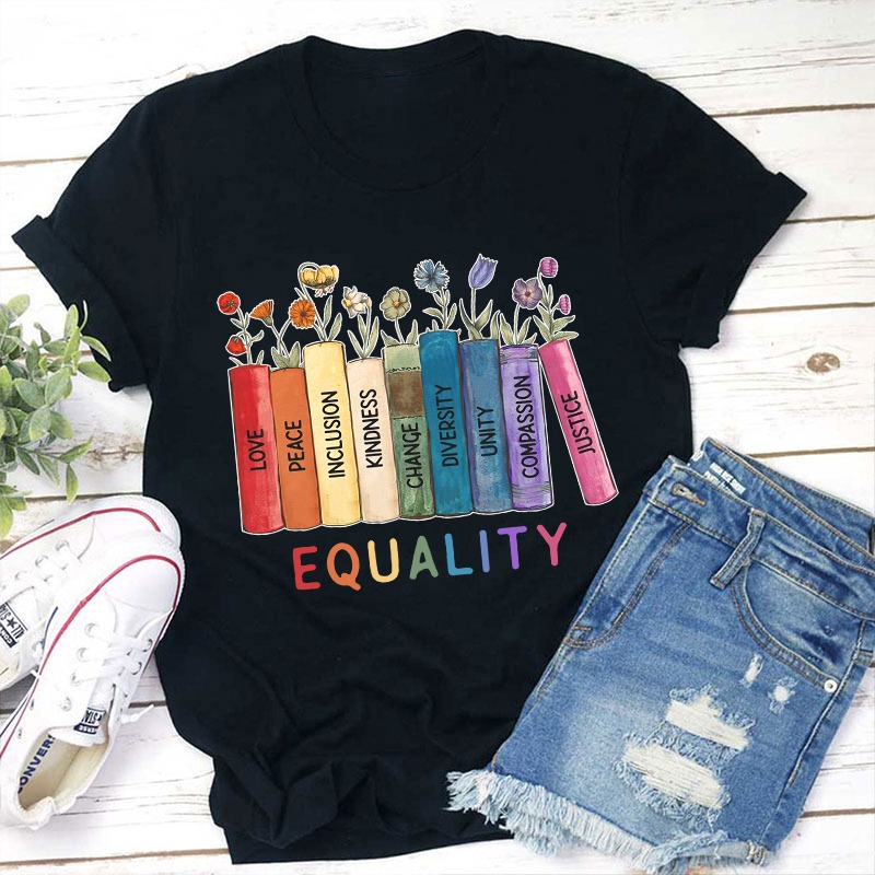 Above the books, delicate flowers bloom, symbolizing growth, learning, and the beauty of diversity. Below the design, the word EQUALITY is printed in a rainbow gradient, reinforcing the message of inclusivity and fairness.