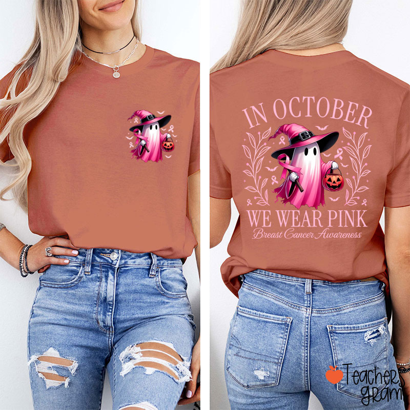 Halloween Beautifully Ghost Picture Breast Cancer Awareness Teacher Two Sided T-Shirt