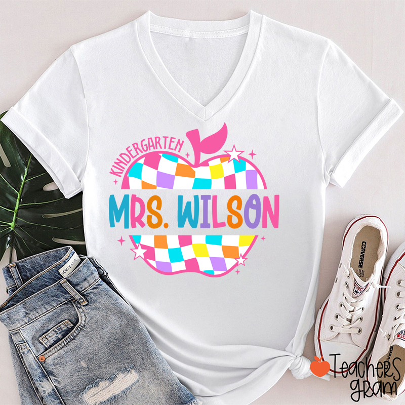 Personalized Colorful Checkerboard Hollow Apple Teacher Female V-Neck T-Shirt
