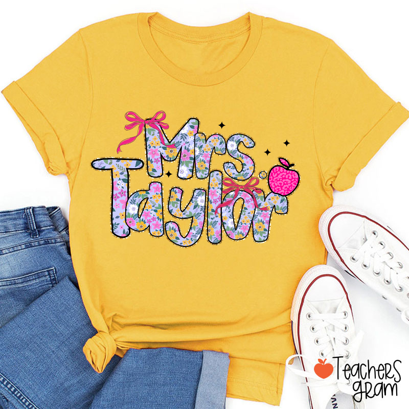 Personalized Name Apple Bow Floral Star Teacher T-Shirt