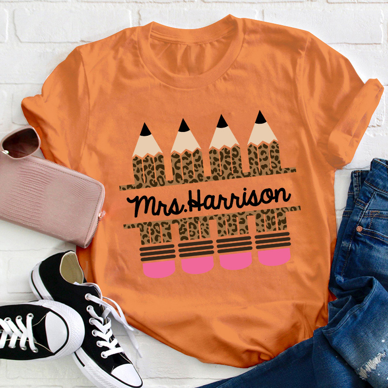 Personalized Name Pink Leopard Pencil Teacher T-Shirt